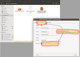 2. Look at the pictures I've post in Step 1 in reference to "Once the file is downloaded, you need to Right-click on the file you downloaded and make it Executable." I did not explain that very well but the pictures show the process. If you do not make the file "NVIDIA-Linux-x86_64-355.11.run" executable it won't run and Step 7 will fail.